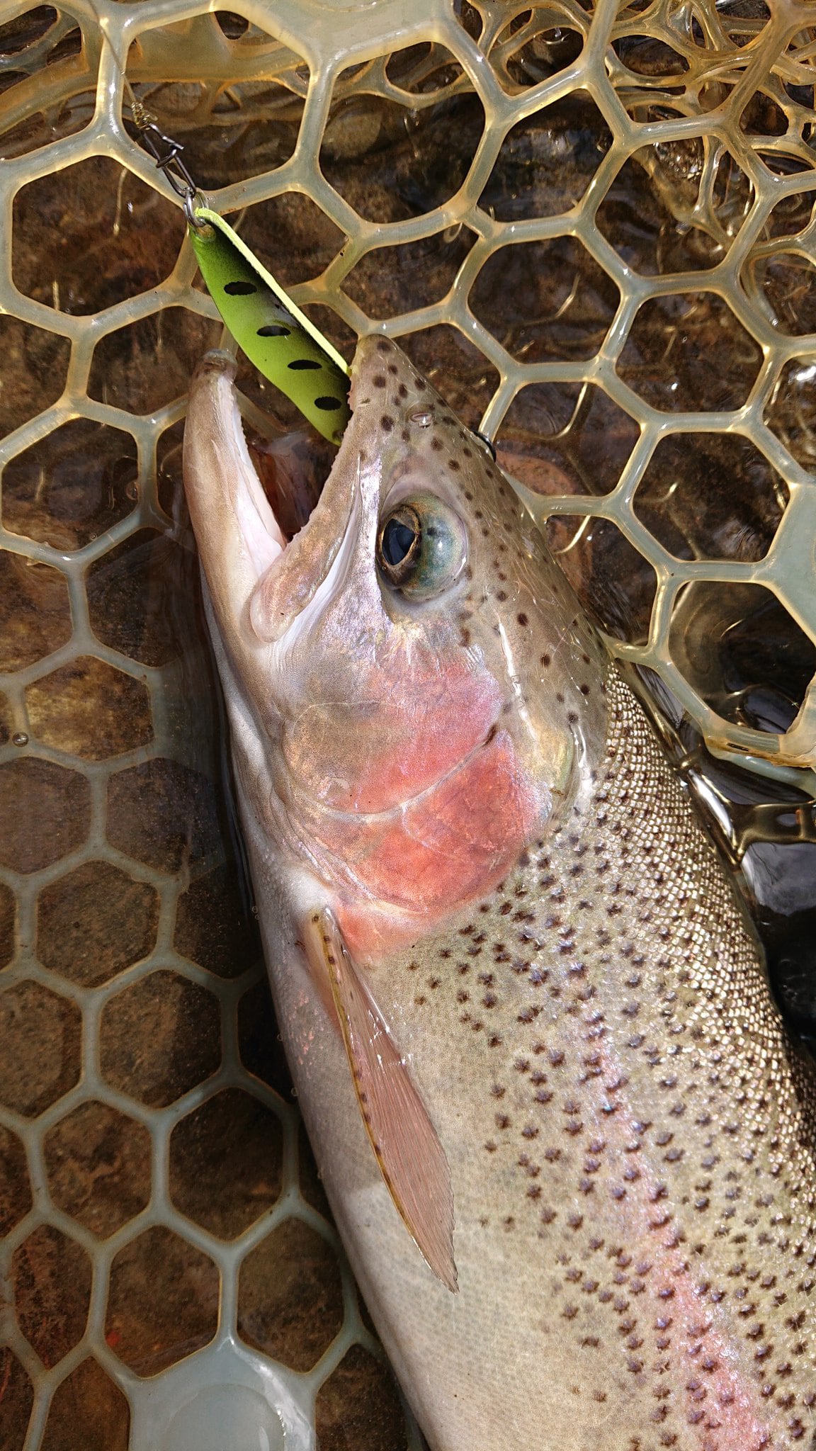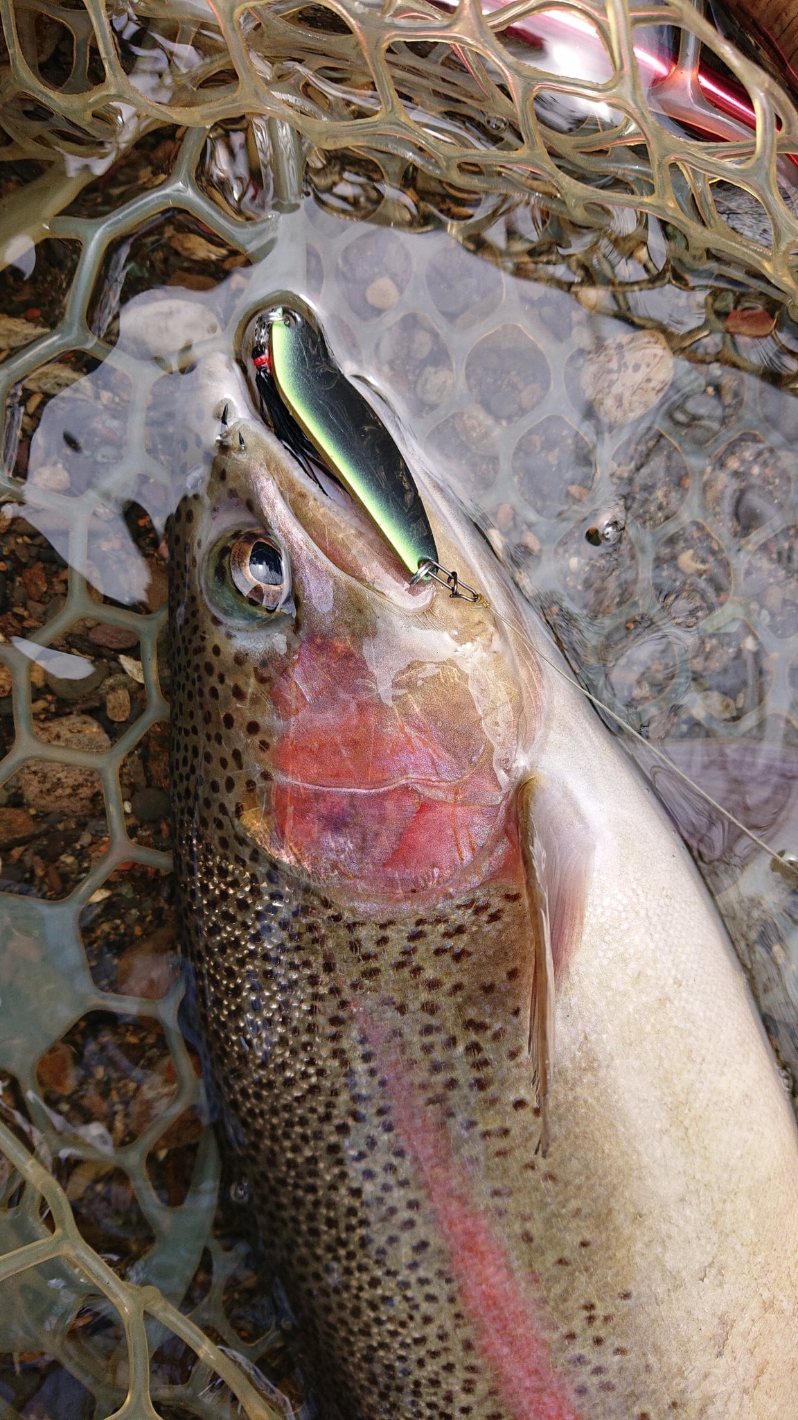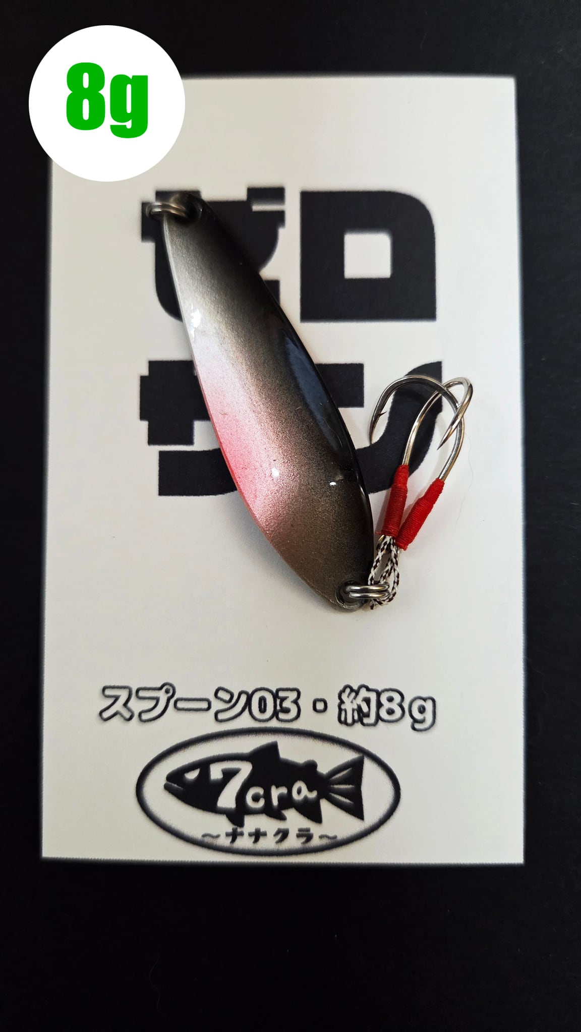 7cra(ナナクラ)ルアーの第4作目。「アメマス・ニジマス等をターゲットにした、細身でも適度な巻抵抗で、アクションは強めでしっかりと泳ぎ、イレギュラーフォールとテンションフォールの明確な使い分けができる7~8g程度の汎用スプーンが欲しい・・・」という思いの元、あらゆる素材とあらゆる形状・曲げを試作してみるも納得がいかず、「スプーン03」は長らく欠番となっていました。しかし、ふとしたキッカケでイトウ用のスプーン01を手削りにてスリム化したところ、理想に近いアクションとなりました。本来イトウ用のスプーン01は、抵抗のあるフェザーフックを装着した状態で良く動くよう調整されており、そのため通常のオープンフックでは大暴れしてマトモに泳がないという特性があります。それがスリム化との相性が抜群という結果に・・・。そして数種類の削りパターンを試して煮詰め、ようやくスプーン03が完成致しました。