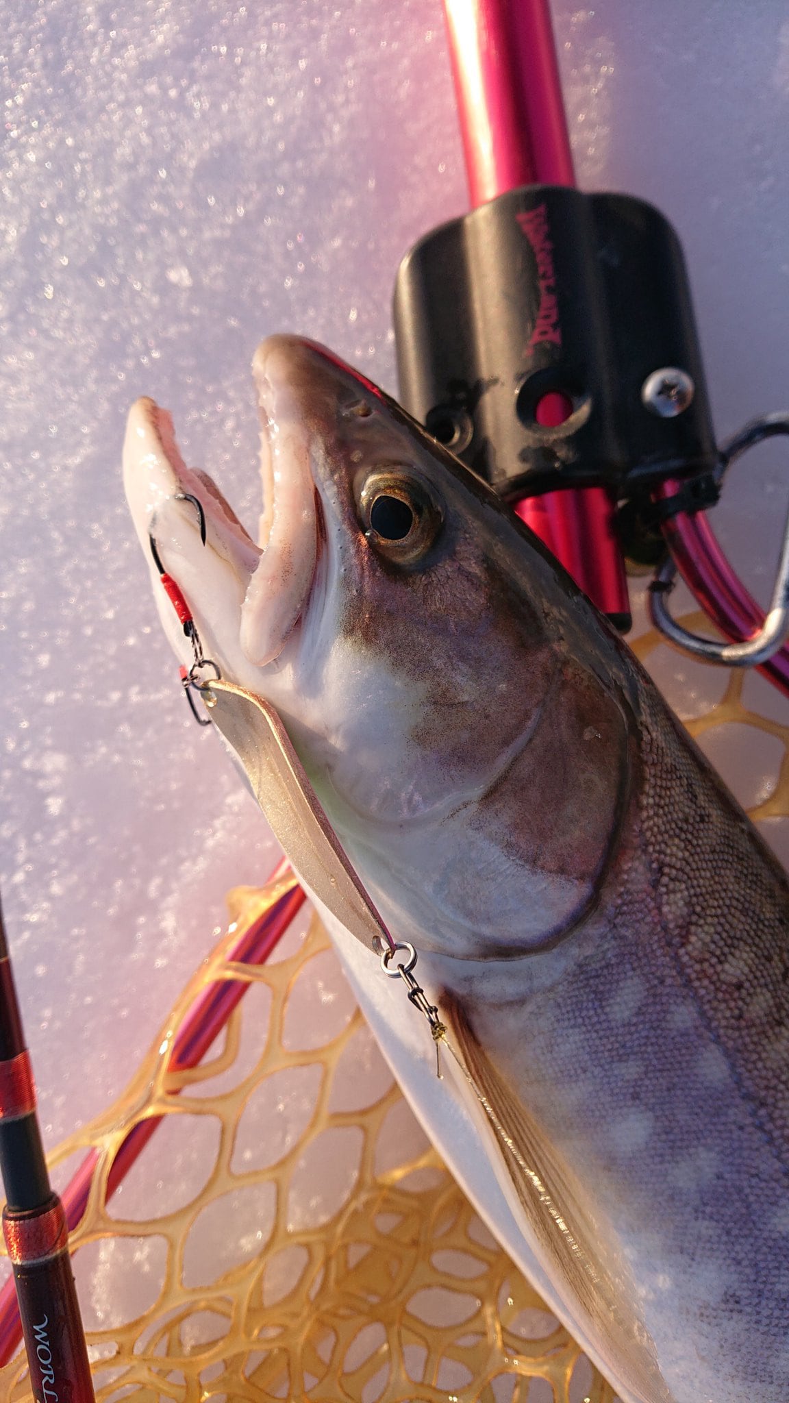 カラーは両面サケチギョ。ダブルスイミングフック仕様(チヌ針6号)で、スプリットリングは信頼のフィールドハンター製2番。ウェイトは約8gです。