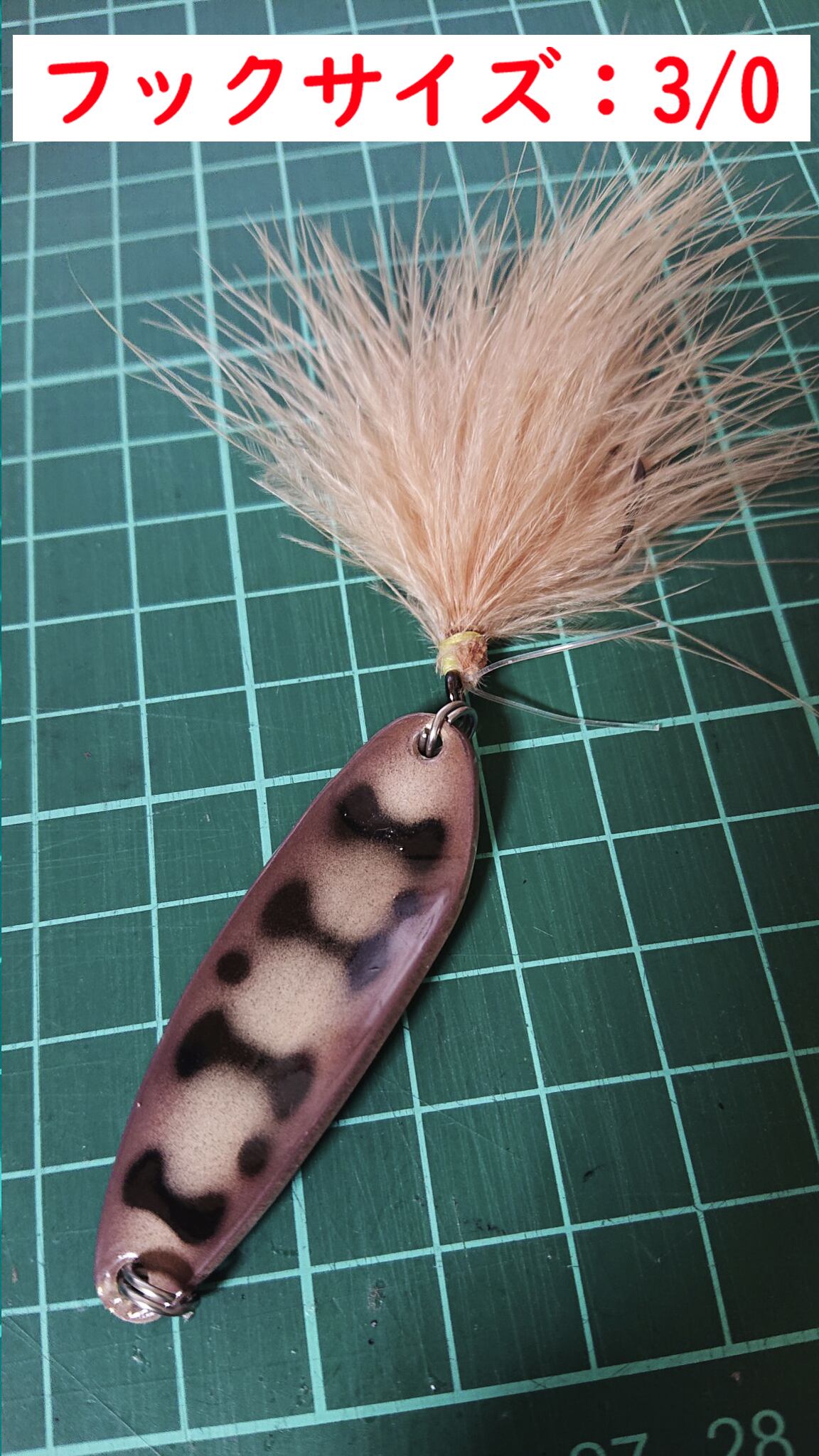 1個入りでカラーはライトブラウンです。フックは対大型仕様でカルティバS-61の3/0、ナナクラスプーン01に装着して使用します。フェザーの柔らかい動きがスプーンに生命感を与え、ジョイントミノーのように動きます。また、ガードが付いているため、ボトム操作時の根掛りを激減させます。
