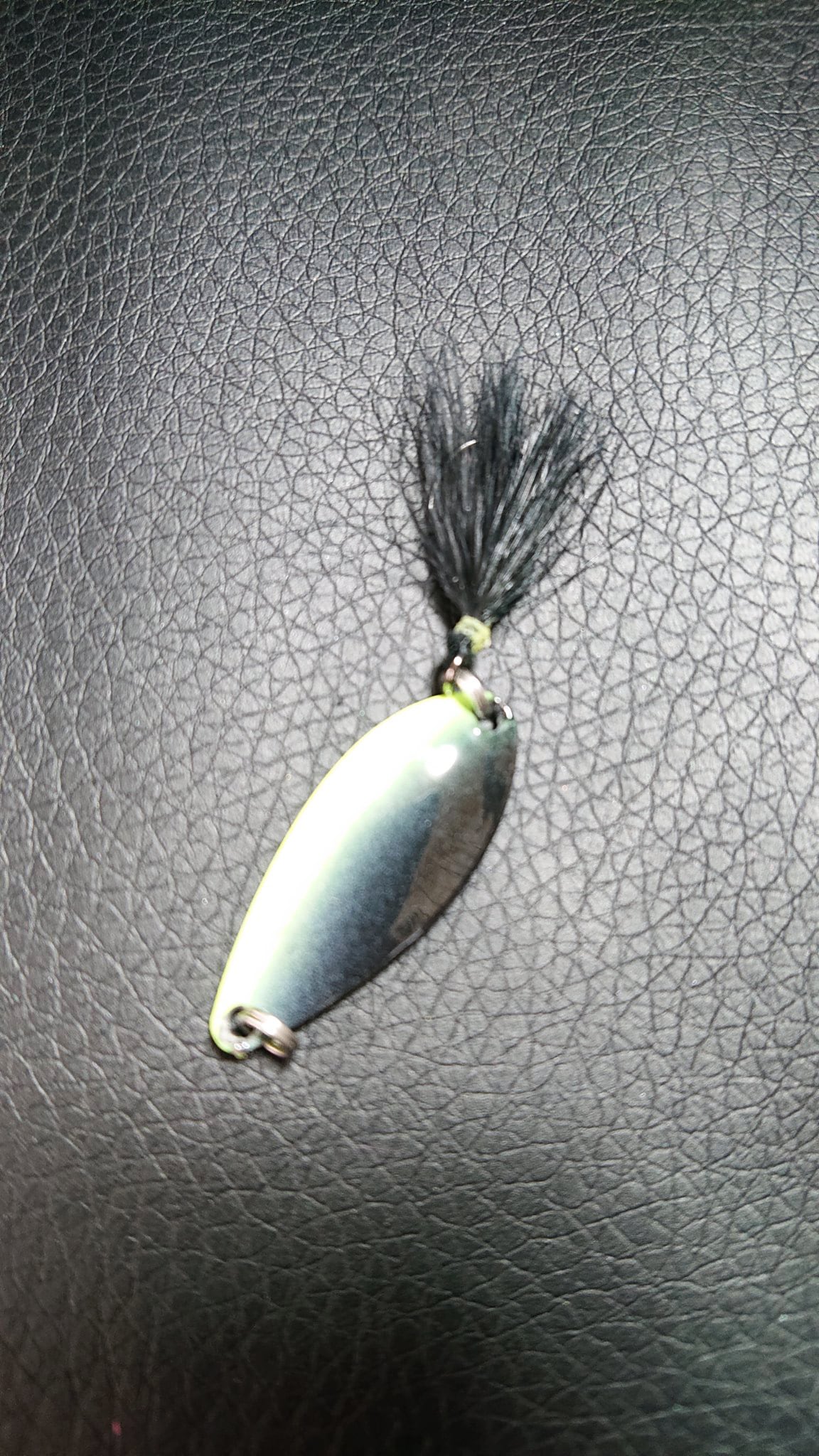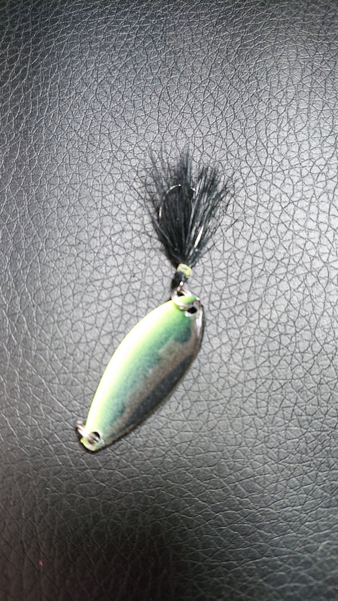 7cra(ナナクラ)ルアーの第3作目、アメマス・ニジマス等のマイクロパターン用として開発した手削り・手曲げのハンドメイドスプーンです。カラーは両面ブラックイエロー。フェザーフック仕様(カルティバS-59・6番)で、ウェイトは約3gです。テンションフォールで細かく震えながら直線的に落ち、フェザーが連動して細かく揺らめきます。その見たことのない動きが通常のスプーンやミノーに反応しない魚を引きずり出します。
