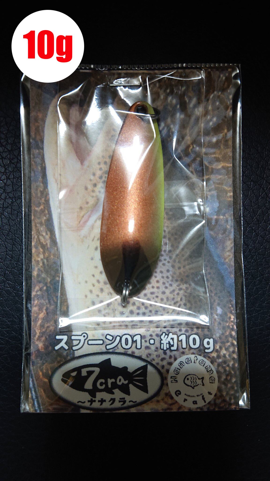 7cra(ナナクラ)ルアーの第1作目、イトウ用として開発したスプーン01のライトウェイトモデルです。カラーはHanatama craftの「みずたま」氏考案の両面コパーイエローダークテイルです。フックレス仕様で、ウェイトは約10gです。イトウ用に最適化されたフォールとスイミング。ライトウェイト化によりフォールを遅くし「食いやすい」動きに仕上がっております。テスト時には「食いが渋い状況」での高い効果が確認でき、103cmと101cmのイトウをランディング。当ショップのガード付きフェザーシングルフックを装着すると、フェザーの柔らかい動きがスプーンに生命感を与え、ジョイントミノーのように動きます。また、ガードが付いているため、ボトム操作時の根掛りを激減させます。スプーン01は100匹以上のイトウ達(うちメーターオーバー3匹)を相手にテストし、開発されました。スプリットリングは信頼のフィールドハンター製3番。
