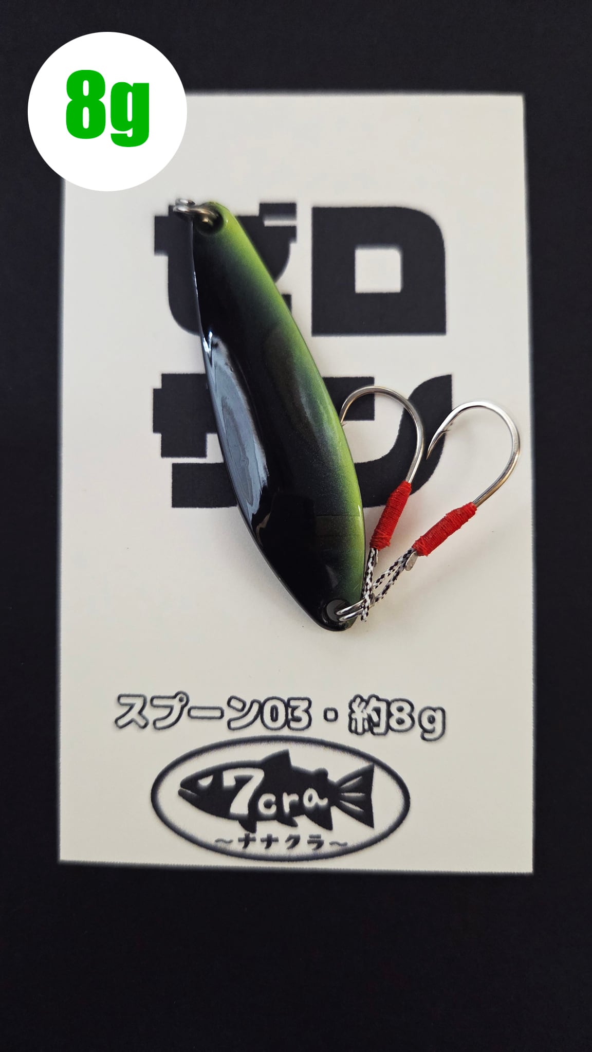 7cra(ナナクラ)ルアーの第4作目。「アメマス・ニジマス等をターゲットにした、細身でも適度な巻抵抗で、アクションは強めでしっかりと泳ぎ、イレギュラーフォールとテンションフォールの明確な使い分けができる7~8g程度の汎用スプーンが欲しい・・・」という思いの元、あらゆる素材とあらゆる形状・曲げを試作してみるも納得がいかず、「スプーン03」は長らく欠番となっていました。しかし、ふとしたキッカケでイトウ用のスプーン01を手削りにてスリム化したところ、理想に近いアクションとなりました。本来イトウ用のスプーン01は、抵抗のあるフェザーフックを装着した状態で良く動くよう調整されており、そのため通常のオープンフックでは大暴れしてマトモに泳がないという特性があります。それがスリム化との相性が抜群という結果に・・・。そして数種類の削りパターンを試して煮詰め、ようやくスプーン03が完成致しました。