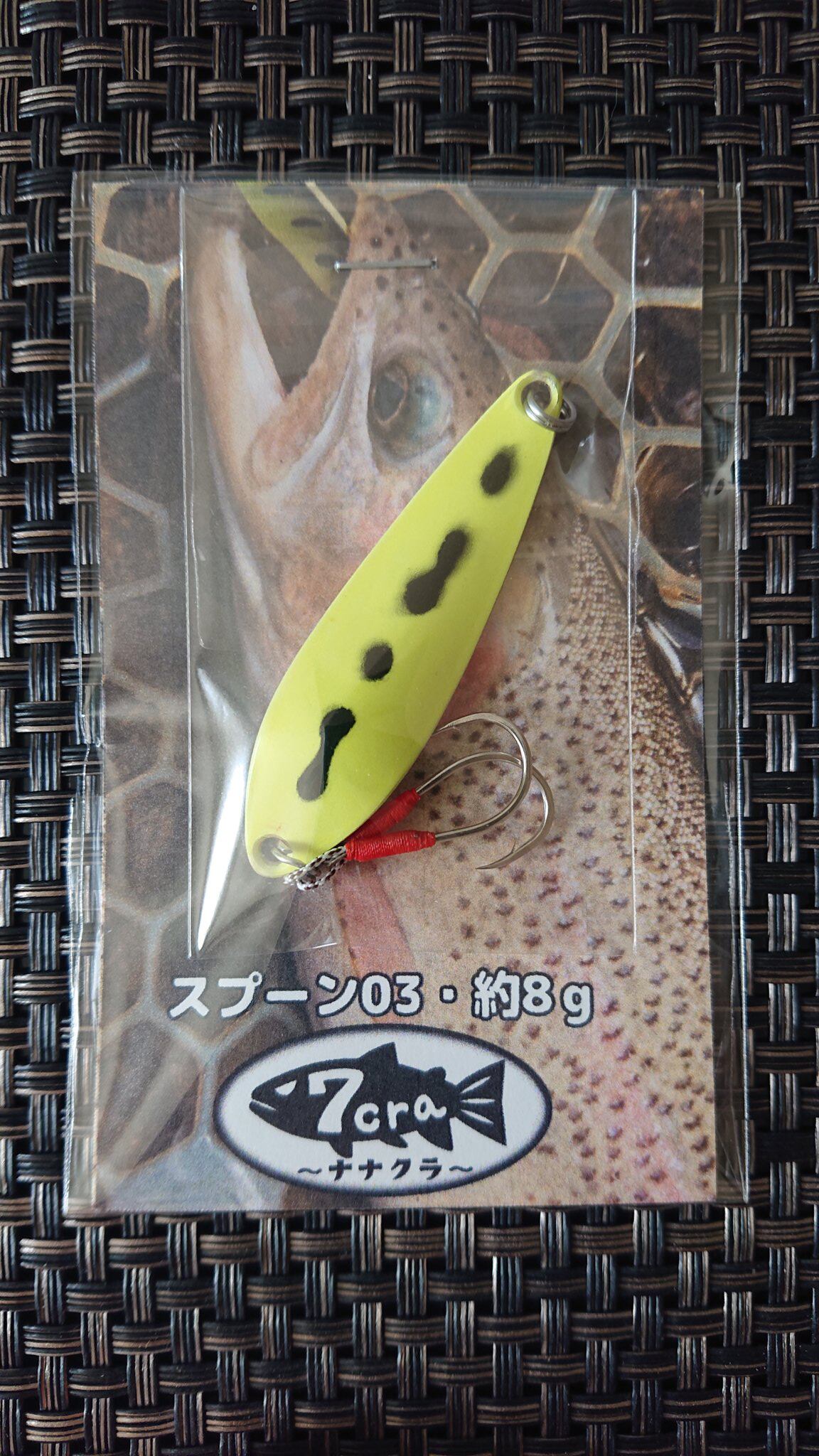 7cra(ナナクラ)ルアーの第4作目。「アメマス・ニジマス等をターゲットにした、細身でも適度な巻抵抗で、アクションは強めでしっかりと泳ぎ、イレギュラーフォールとテンションフォールの明確な使い分けができる7~8g程度の汎用スプーンが欲しい・・・」という思いの元、あらゆる素材とあらゆる形状・曲げを試作してみるも納得がいかず、「スプーン03」は長らく欠番となっていました。しかし、ふとしたキッカケでイトウ用のスプーン01を手削りにてスリム化したところ、理想に近いアクションとなりました。本来イトウ用のスプーン01は、抵抗のあるフェザーフックを装着した状態で良く動くよう調整されており、そのため通常のオープンフックでは大暴れしてマトモに泳がないという特性があります。それがスリム化との相性が抜群という結果に・・・。そして数種類の削りパターンを試して煮詰め、ようやくスプーン03が完成致しました。