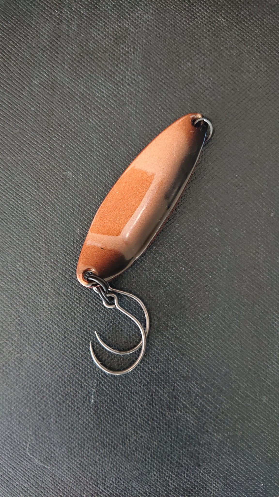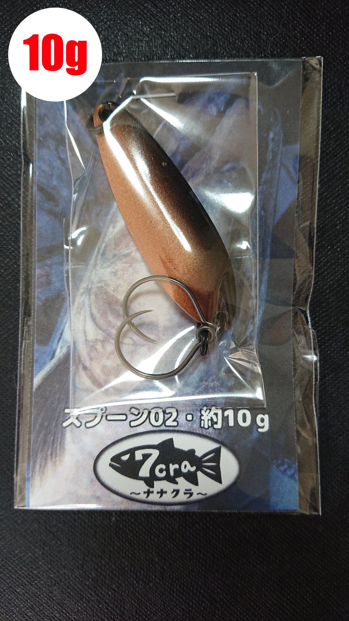 7cra(ナナクラ)ルアーの第2作目、イトウ・アメマス用のオープンフック用スプーンであるスプーン02の軽量モデル。カラーはコパーブラックです。ウェイトは約10gで、純正フックはsacana社のHaken1 Barbed Medium2番のダブルフック仕様。スプリットリングは信頼のフィールドハンター製3番。イトウ用のスプーン01の後部を若干スリムにし、ピッチの早いイレギュラーフォールへと最適化しました。