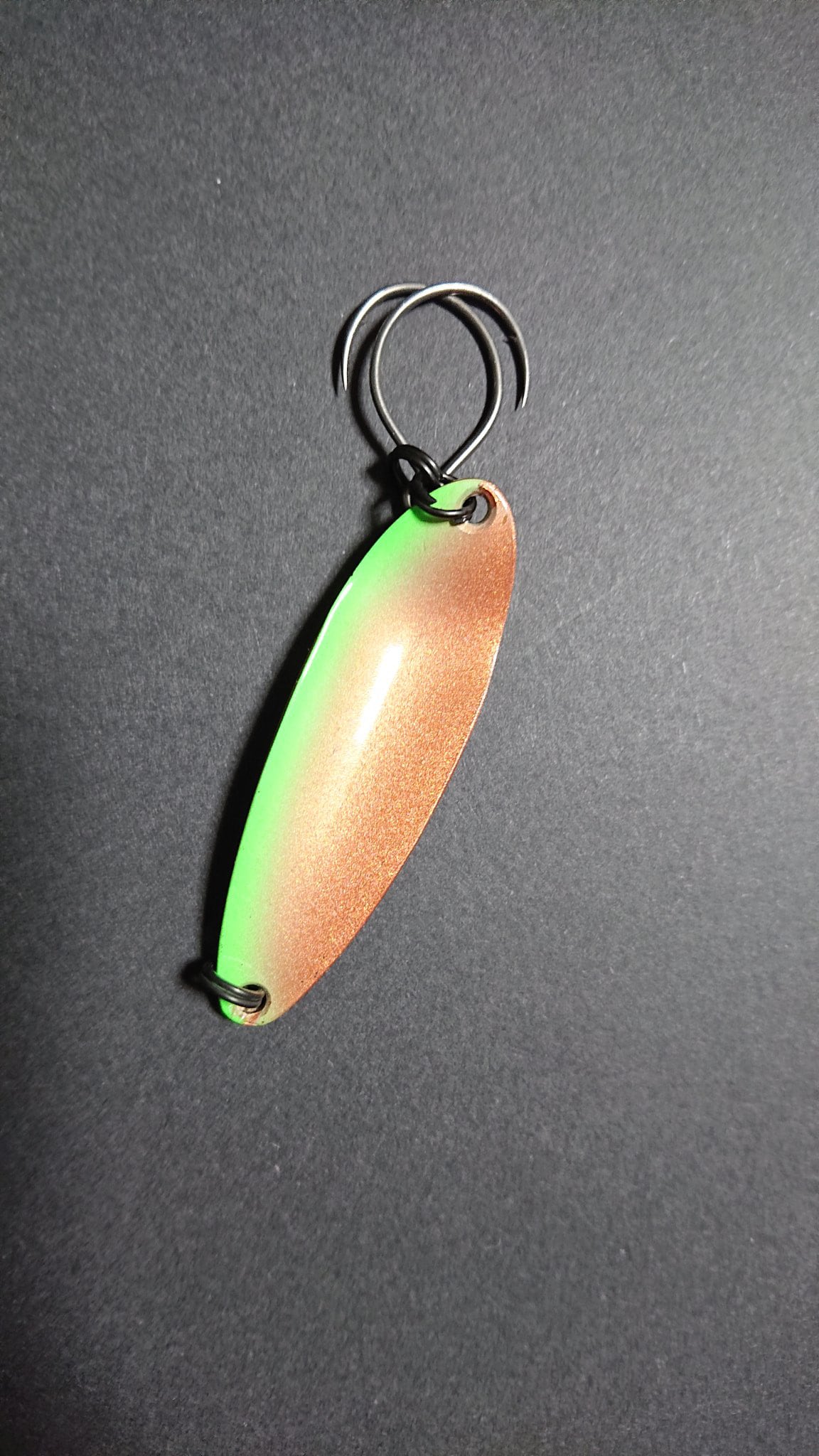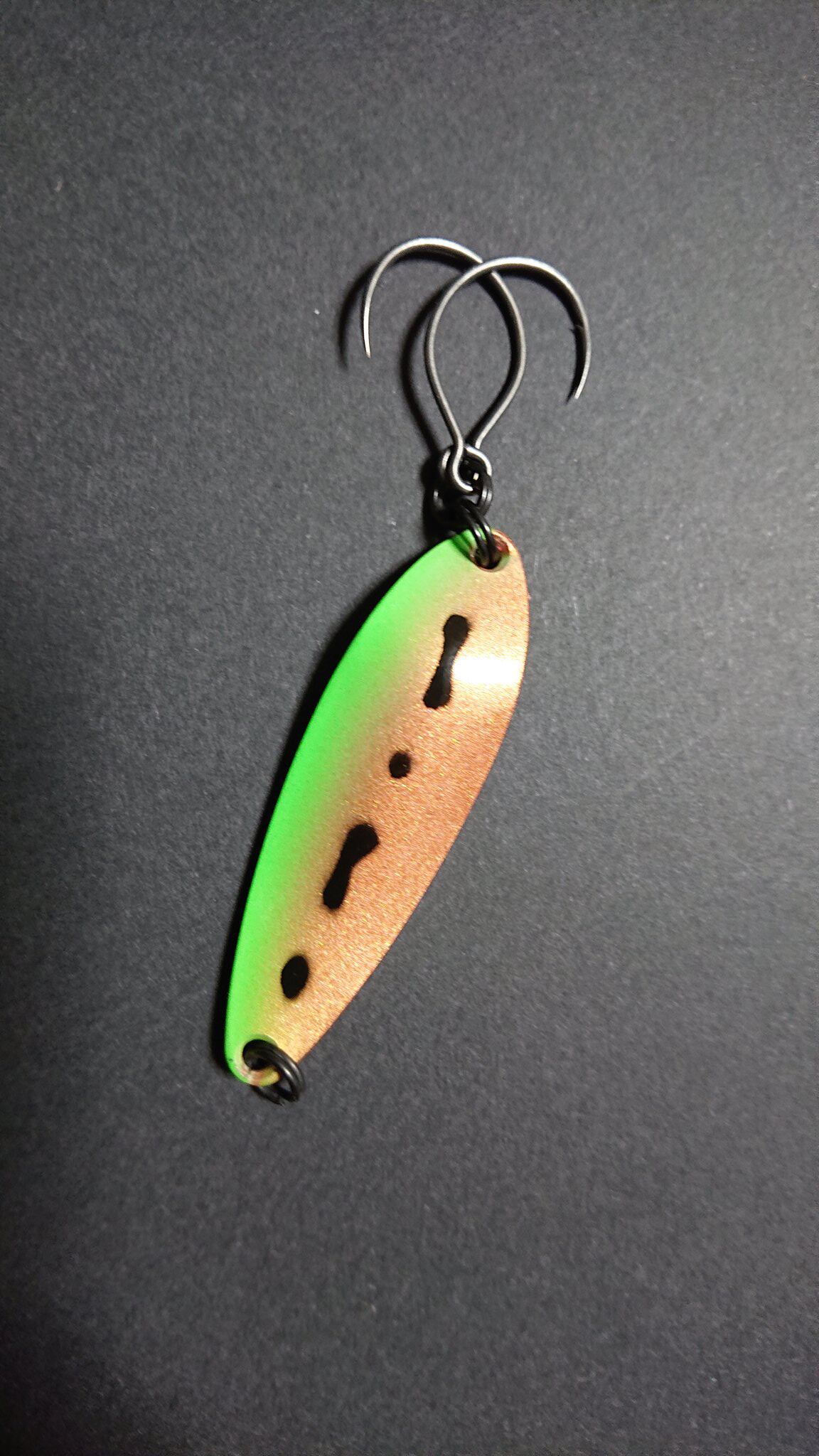 7cra(ナナクラ)ルアーの第2作目、イトウ・アメマス用のオープンフック用スプーンです。カラーはブラックドットコパーグリーン、ウェイトは約11gです。純正フックはsacana社のHaken1 Barbed Medium2番のダブルフック仕様。スプリットリングは信頼のフィールドハンター製3番。イトウ用のスプーン01の後部を若干スリムにし、ピッチの早いイレギュラーフォールへと最適化しました。